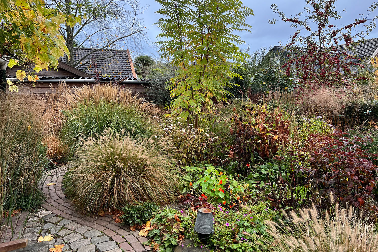 In de winter verliezen de meeste hun planten hun kleur en hult de tuin zich in vele tinten bruin. De meeste vaste planten, grassen en struiken hebben een mooi winterbeeld door hun silhouetten. Het tuingedeelte tussen het huis en de kas bevat veel wintergroene planten zoals varens, fatsia, bamboe, Portugese laurier en bodembedekkers.